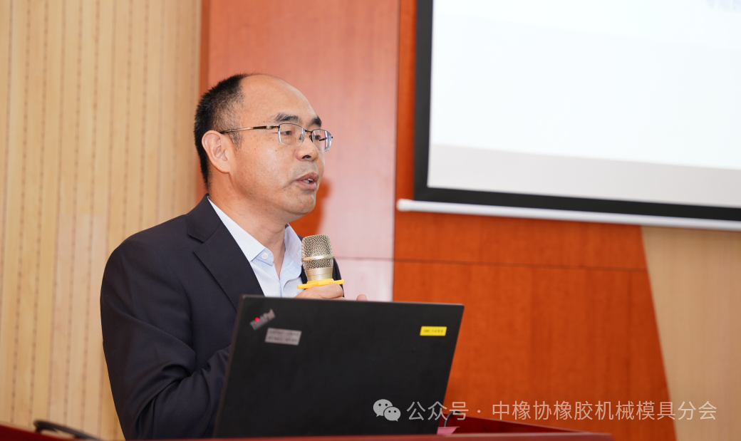 中橡协橡胶机械模具分会理事长、软控股份总裁官炳政作了《我国橡胶机械模具行业经济运行情况及展望》的报告。官炳政对过去一年橡胶机械模具分会的工作成绩进行了总结。他说,橡机模具产业发展具有周期性波动特点,行业或将迎来“阵痛期”。展望行业发展未来,机遇与竞争并存。面对市场压力、成本压力等问题,行业需要有强大的内驱力,主要做好四方面工作:一是聚焦极致性价比,走好企业精益之路;二是基于客户痛点,聚焦关键工艺制程升级与智能化转型;三是积极拥抱全球化,做好本土化服务;四是积极践行可持续发展理念。